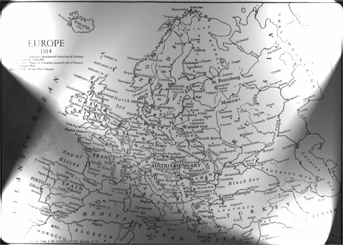 Site Ed. Note: The transitional map below, (formed from images of two maps contained in Global Atlas of the World at War, 1944, World Publishing, NY), shows initially the territorial lines existing at the outbreak of World War I in 1914, then the post-Versailles Treaty boundaries of 1919 through 1938, the moving red circle indicating the approximate area of the disputed Danzig and the Corridor between Germany and the German territory of East Prussia.