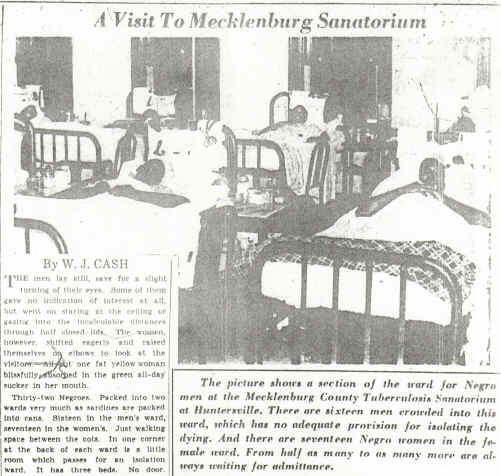 Site ed. note: This piece is the only known instance of Cash turning to reporting in his later years and one of only a few human interest stories he ever wrote--though,of course, virtually all of his writing was "human interest" in the broader sense. The compassionate article, which appeared as a rare locally produced feature on the regular editorial page, must have turned some heads at the time; it is hard to imagine now that such conditions actually existed in health care a mere 60 years ago in and around a city the size of Charlotte, then, just under 100,000 in population. It is even harder to imagine the segregated facilities and grossly disparate conditions. But they existed and even in the lifetimes of those of us born as late as the early fifties. Cash's stressed distinction between the treatment afforded blacks and whites in the facility is especially moving; his appeal to the practical side of whites, compulsory in those days to reach the broader mass, especially those in the hierarchy of the community, appears at the conclusion of the article--an it-is in-your-best-interests-to-improve approach to problems echoed often in The Mind of the South.